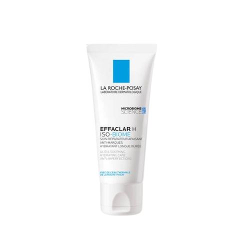 Le Soin Réparateur Apaisant Anti-Marques Hydratant Longue Durée Effaclar H ISO-BIOME est une crème visage conçue pour les peaux fragilisées par les soins thérapeutiques de l’acné sévère, comme la molécule Isotrétinoïne qui peut rendre la peau sèche.