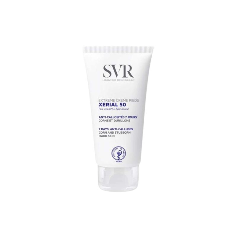 XERIAL 50 Extrême Crème Pieds, le soin kératolytique efficace dès 7 jours. Il réduit l’épaisseur des callosités et des durillons rebelles grâce au pouvoir du brevet SVR avec une très forte concentration d’urée pure à 50% couplé à de l’acide salicylique. Les pieds retrouvent rapidement plus de douceur et un aspect plus régulier.
